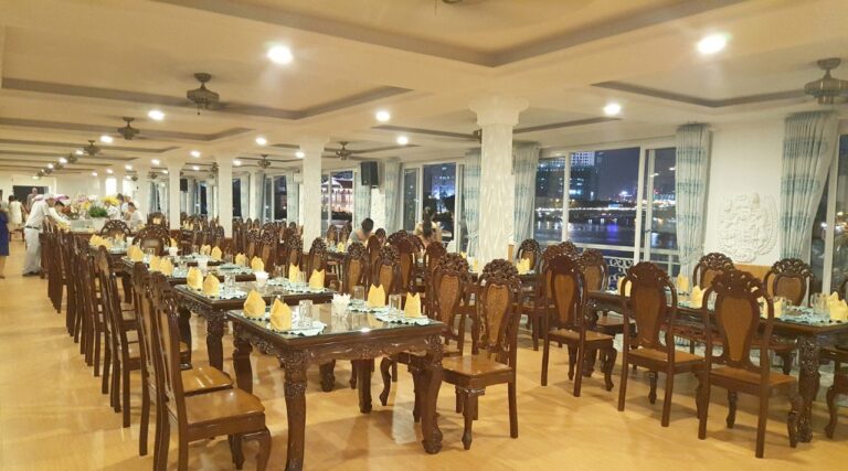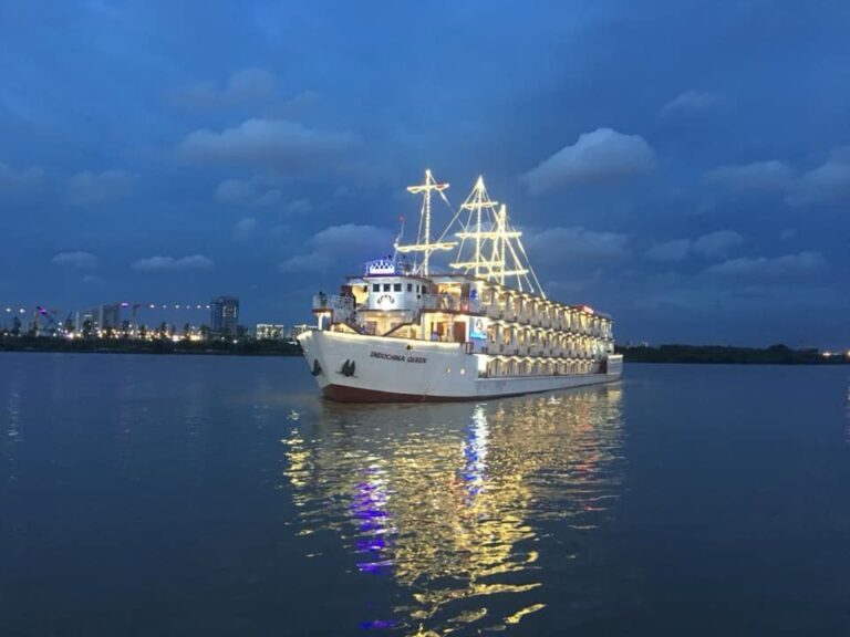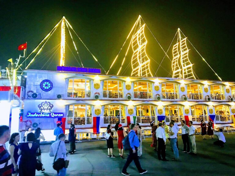 - 18h00: Tàu Indochina Queen cập bến đón khách tại Bến Cảng Sài Gòn, Số 5 Nguyễn Tất Thành, Quận 4, HCM ( gần Ngay Bến Cảng Nhà Rồng ).